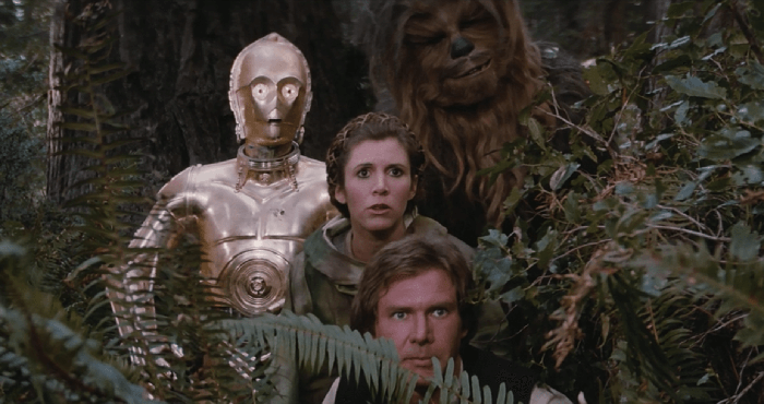 Enter our heroes. Han Solo (Harrison Ford), Leia Organa (Carrie Fisher), and Luke Skywalker (Mark Hamill), accompanied by droids C-3PO (Anthony Daniels) and R2-D2 (Kenny Baker), lead a team to Endor to destroy the shield generator. In the meantime, Lando Calrissian (Billy Dee Williams) and Chewbacca (Peter Mayhew), piloting the Millennium Falcon, lead the Rebel assault on the Death Star. The movie ends with an epic three-pronged finish as one team battles on Endor, another in space above, and Luke on the Death Star finally confronting Darth Vader.