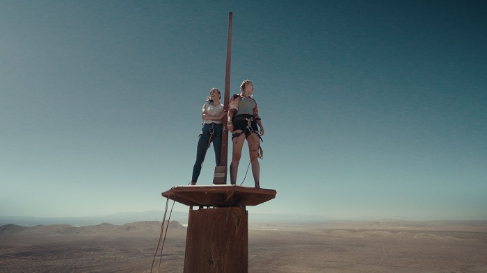 Just as Becky has about had all she can take, she’s surprised by a visit from Hunter (Virginia Gardner), her best friend who she hasn’t seen in months. Hunter was there on the rock face with Becky and Dan the day he died. Determined to get her friend out of the apartment, Hunter plans an outing. But not to have coffee, to see a movie, to take a hike, or do some shopping. No, instead Hunter recommends they climb to the top of a remote 2,000-foot television tower.